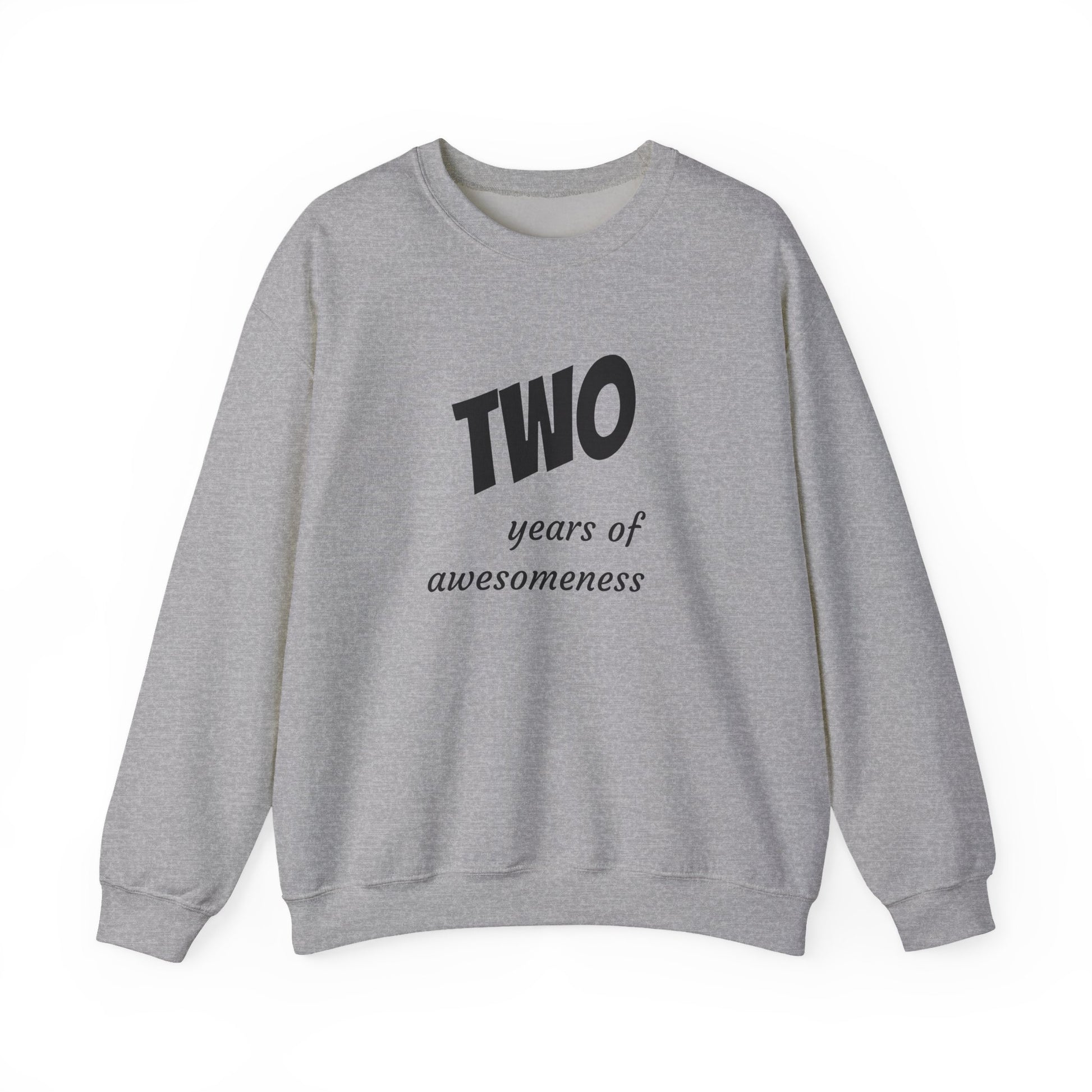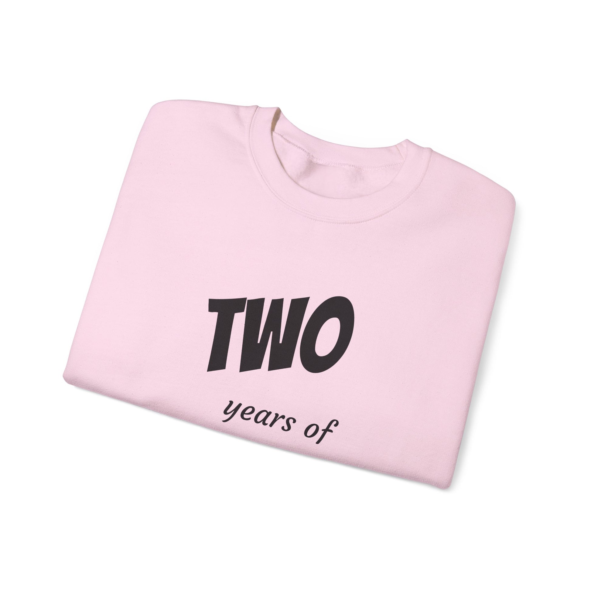 Soft, roomy, and quietly celebratory — this crewneck wraps a simple milestone in calm confidence. The clean white canvas puts the bold “TWO” graphic and gentle subline front-and-center, so the wearer carries a small, personal trophy of two years lived, learned, or loved. It feels like a favorite sweater pulled on for a cozy coffee date, a low-key birthday morning, or a family photo where the moment matters more than the fuss. Durable stitching and a smooth, tear-away label keep distractions away so the sentiment can do the talking.