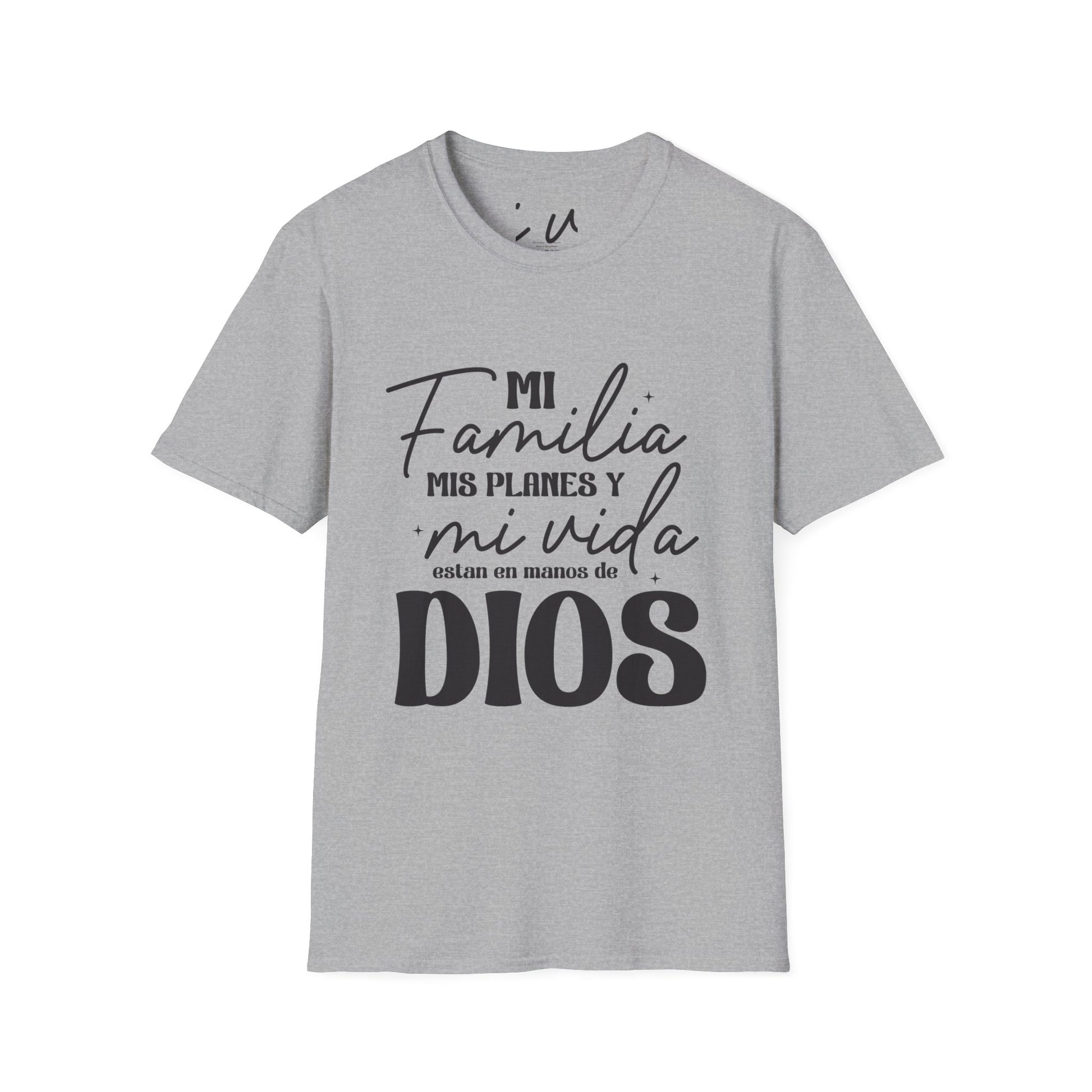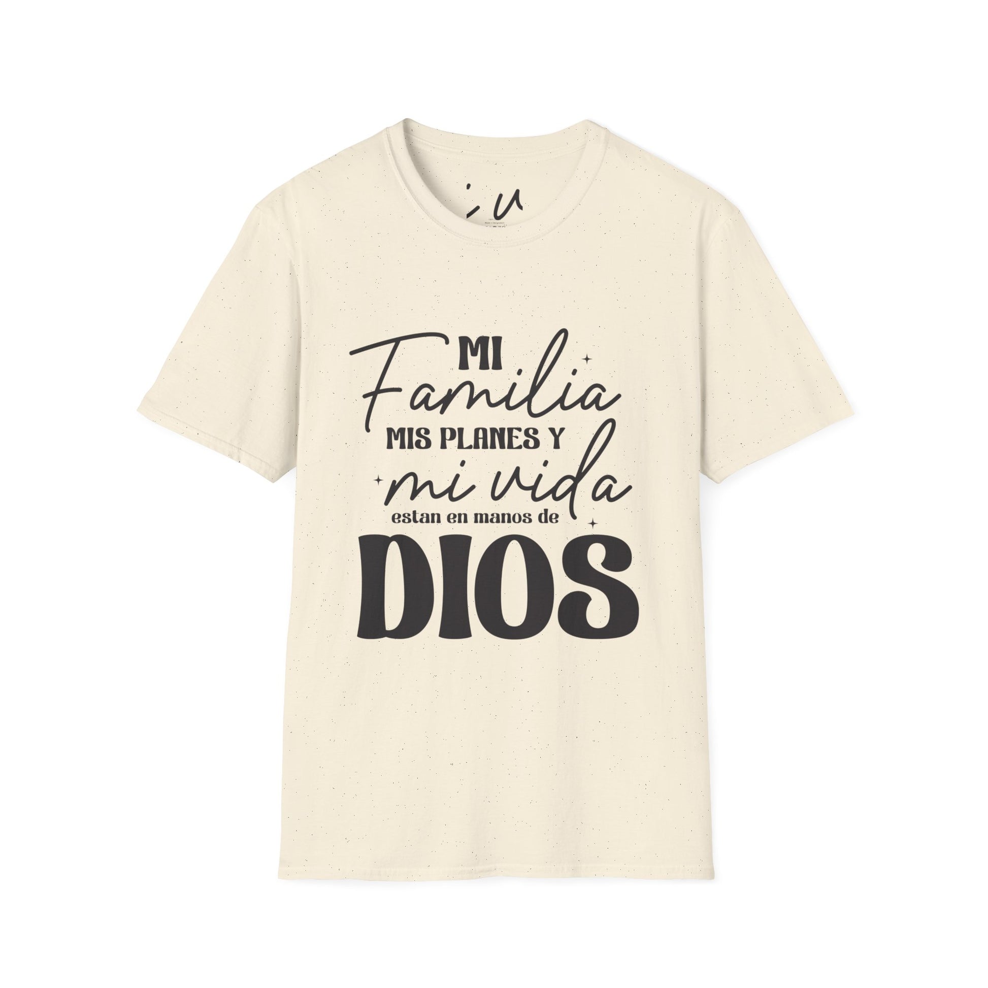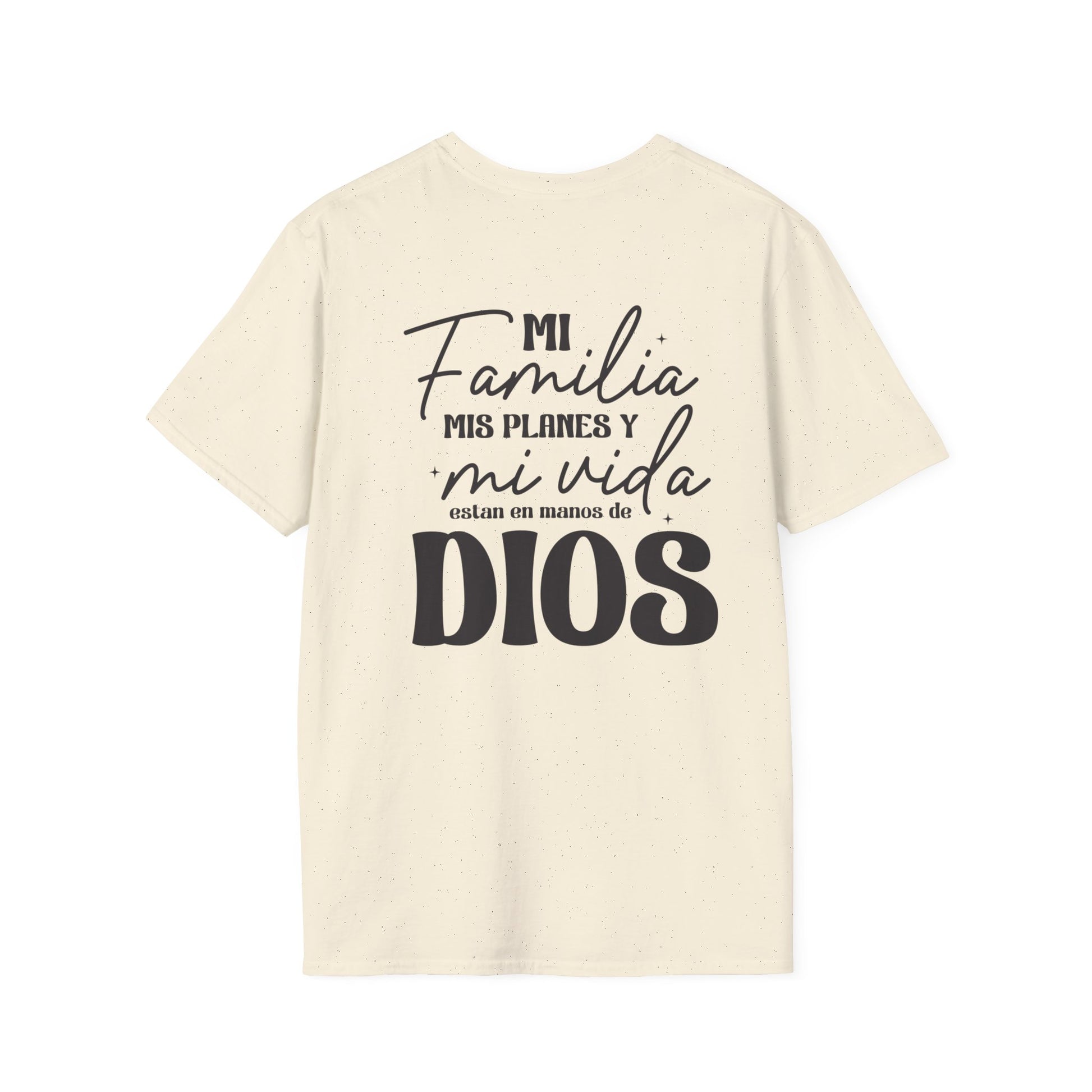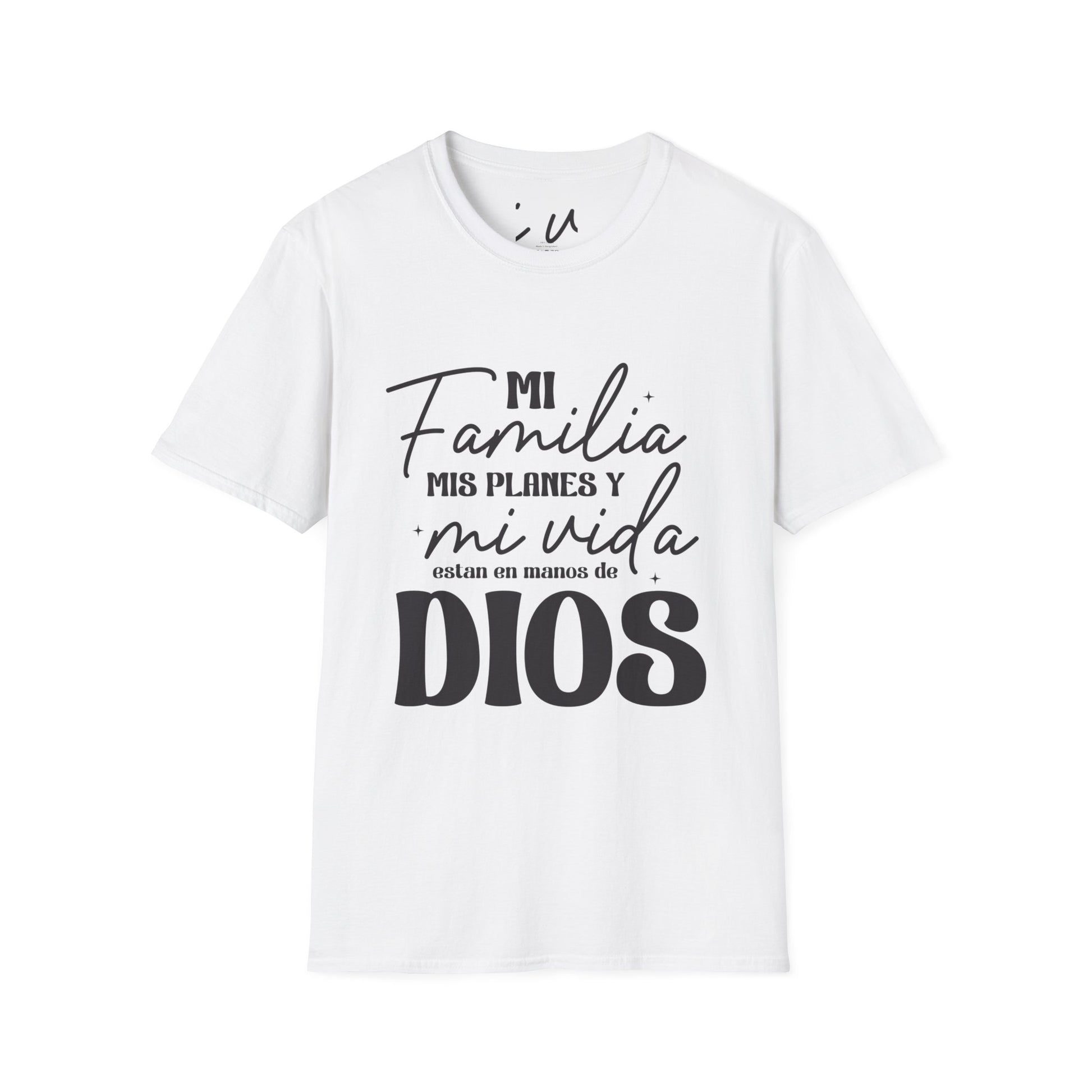 Introducing a classic Unisex Softstyle T-Shirt that speaks to the heart. This shirt embodies comfort and style, making it the perfect addition to any wardrobe. Featuring a meaningful design with Spanish text that translates to 'My family, my plans, and my life are in God's hands,' it resonates deeply with those who value faith and family. The lightweight 100% ring-spun cotton fabric ensures all-day comfort, making it ideal for both casual outings and spiritual gatherings. This t-shirt is perfect for individuals who cherish their beliefs, making it a thoughtful gift for family and friends during holidays, religious celebrations, or everyday wear. Celebrate life's moments with this versatile tee that can be paired effortlessly with any outfit, adding a touch of heartfelt sentiment to your daily life.