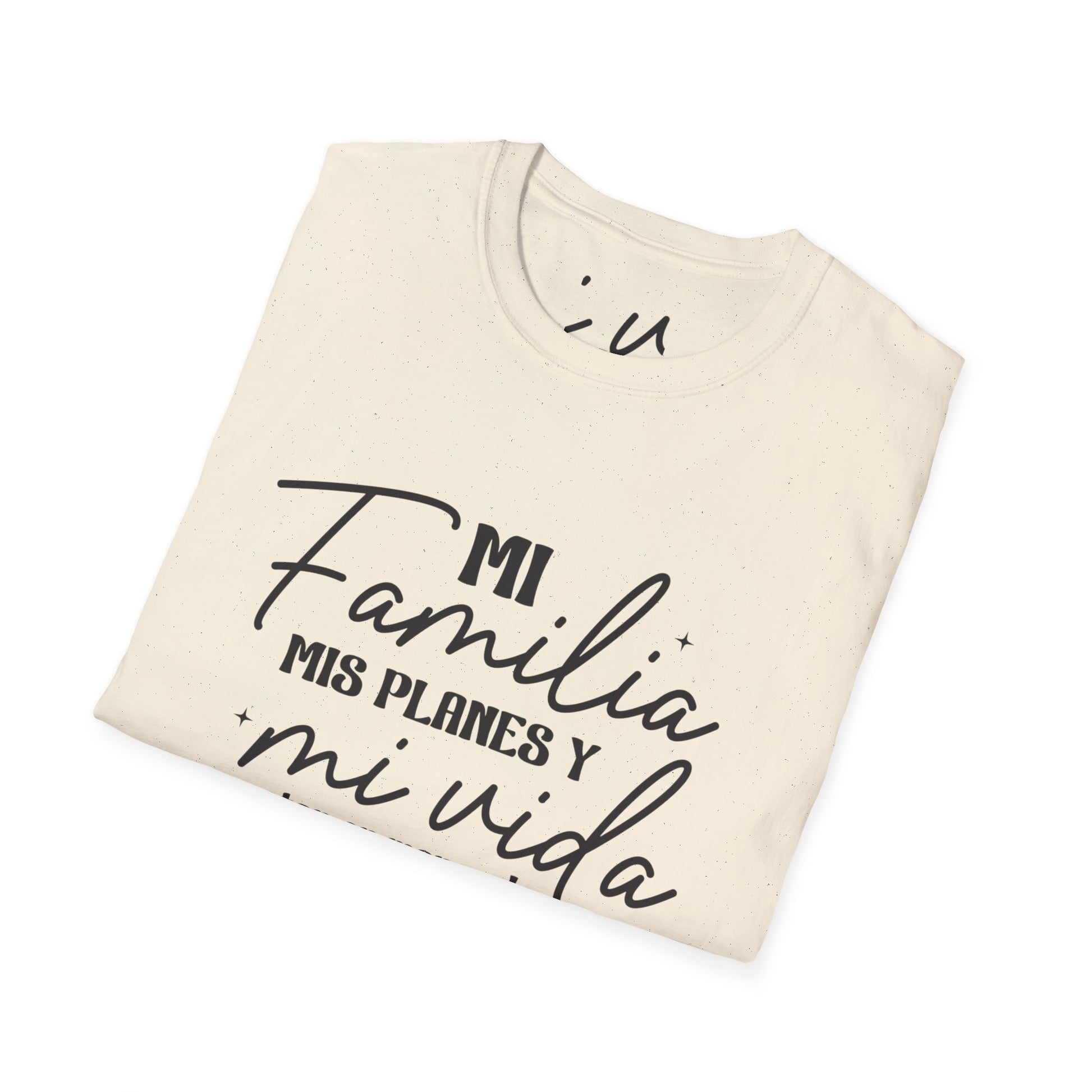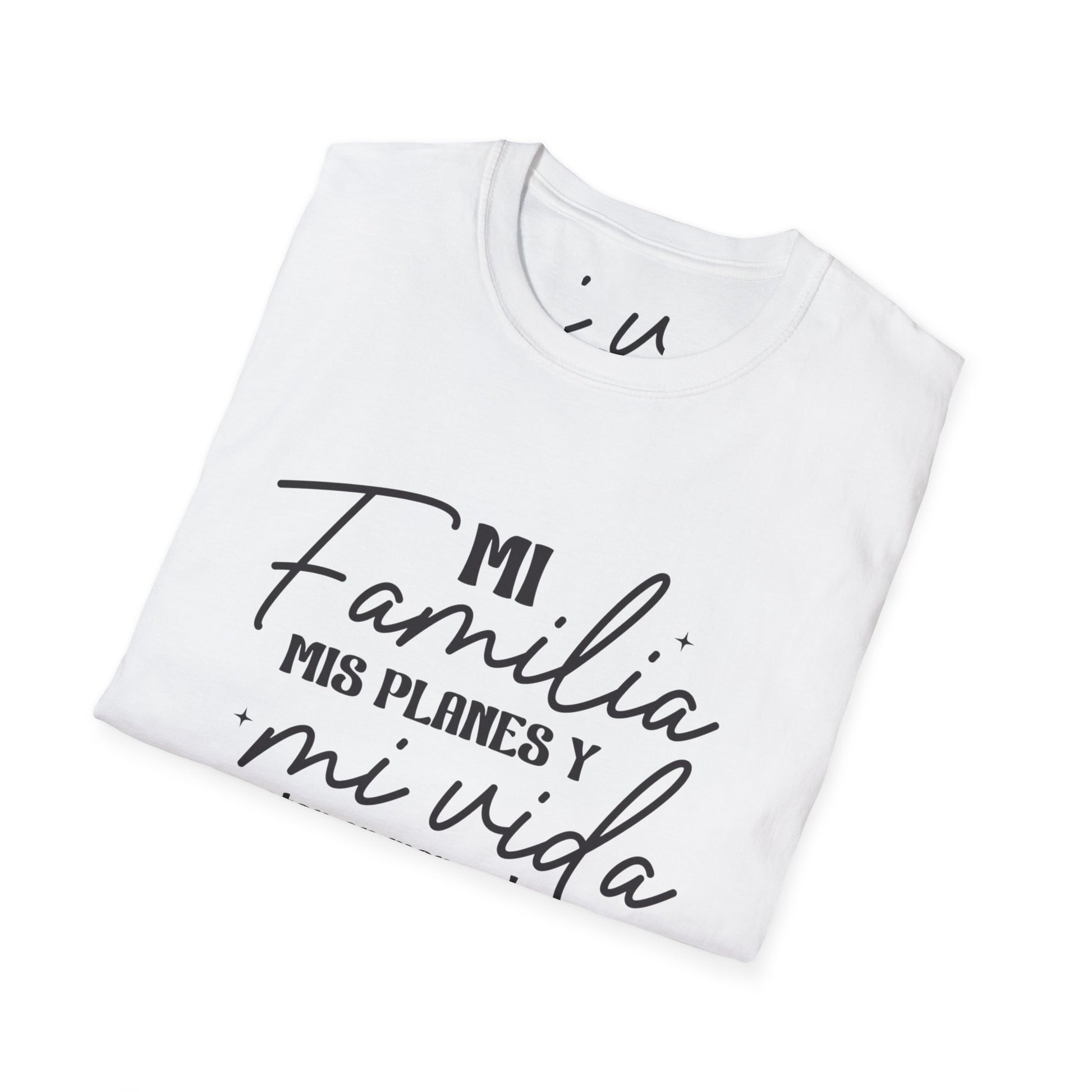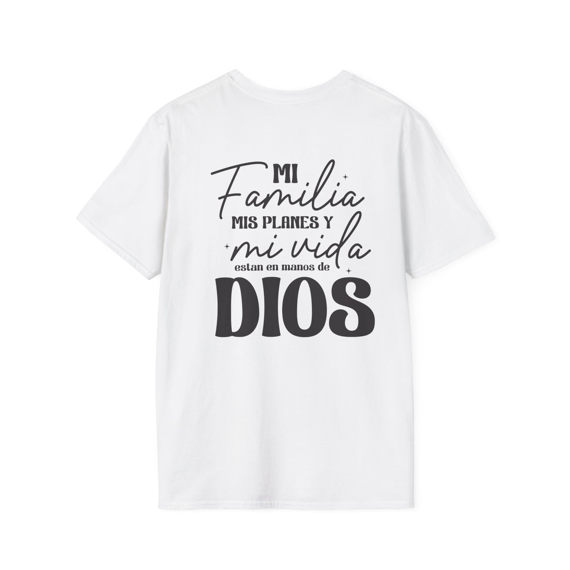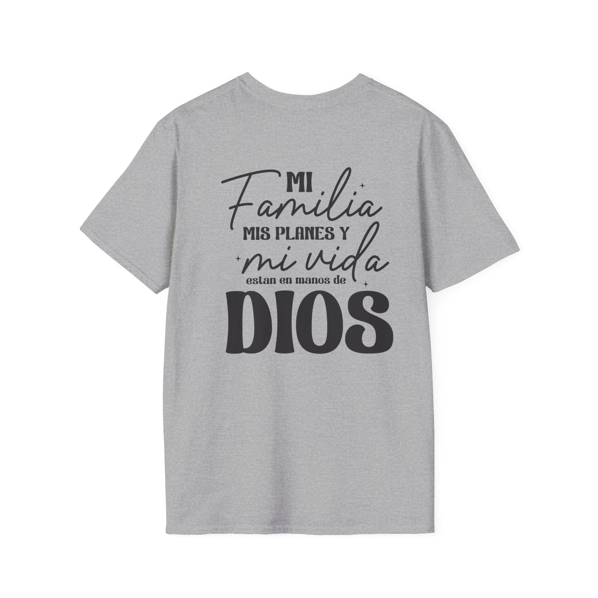 Introducing a classic Unisex Softstyle T-Shirt that speaks to the heart. This shirt embodies comfort and style, making it the perfect addition to any wardrobe. Featuring a meaningful design with Spanish text that translates to 'My family, my plans, and my life are in God's hands,' it resonates deeply with those who value faith and family. The lightweight 100% ring-spun cotton fabric ensures all-day comfort, making it ideal for both casual outings and spiritual gatherings. This t-shirt is perfect for individuals who cherish their beliefs, making it a thoughtful gift for family and friends during holidays, religious celebrations, or everyday wear. Celebrate life's moments with this versatile tee that can be paired effortlessly with any outfit, adding a touch of heartfelt sentiment to your daily life.